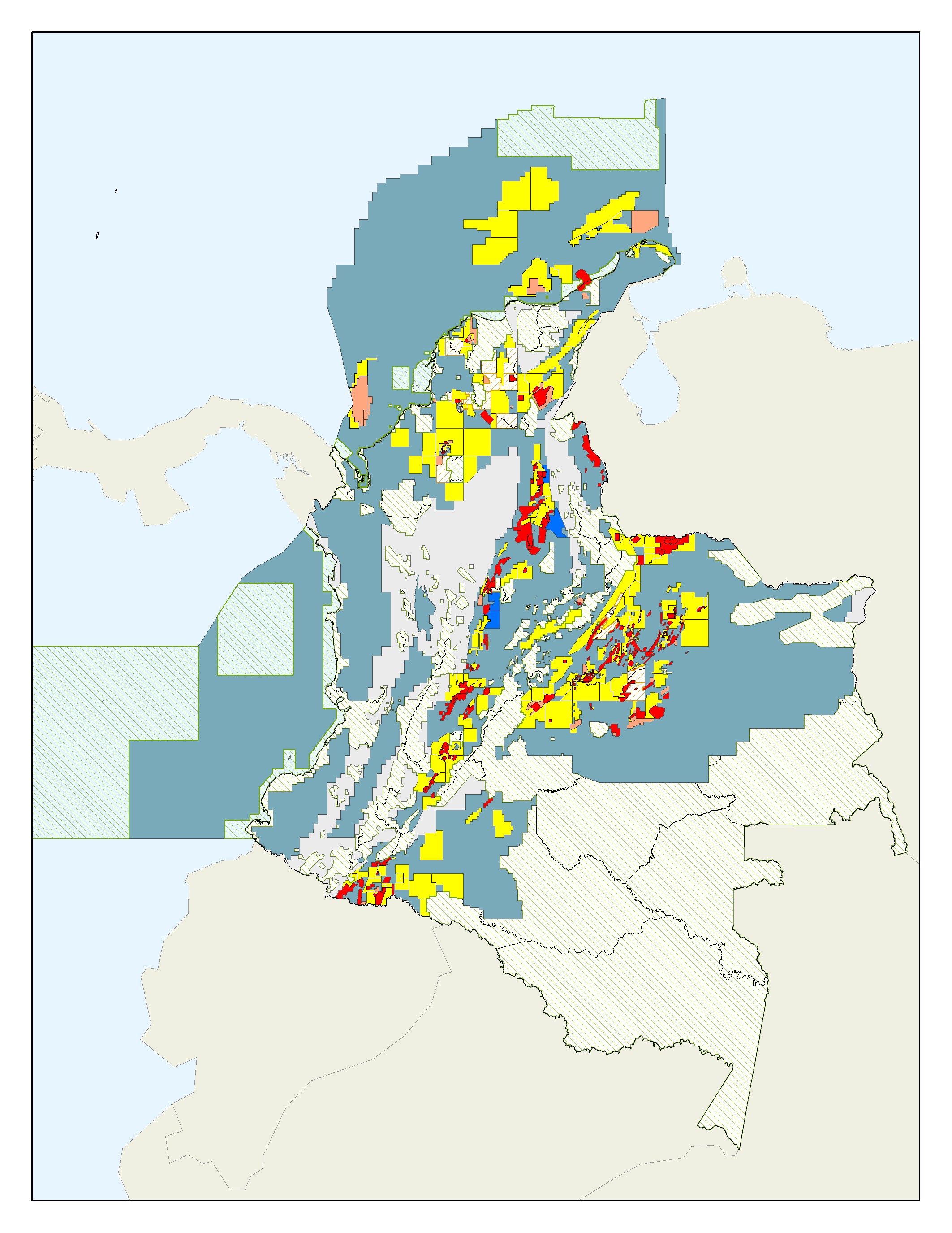 Description: Mapa de tierras de Colombia: El estado de las áreas en Colombia se representa gráficamente en el Mapa de Tierras, el cual es actualizado continuamente. En él se muestran las áreas que se encuentran en Exploración, Evaluación y Explotación y las áreas disponibles para la celebración de Contratos en las diferentes cuencas sedimentarias del país. Áreas en Exploración (Bloques de color amarillo): son aquellos sobre los cuales se realizan trabajos de exploración, incluye los contratos directos de ECP, los de asociación con ECP y los firmados con la ANH. Áreas en Evaluación Técnica (Bloques de color azul): son aquellos sobre los cuales se realizan trabajos de evaluación asignados por la ANH. Áreas en Explotación (Bloques de color rojo): son aquellas en los cuales se adelantan labores de explotación de hidrocarburos. Áreas en Evaluación (Bloques color salmón): aquellas en las cuales se ha decidido llevar a cabo un programa de evaluación destinado a establecer comercialidad. Áreas Disponibles (Bloques de color gris): aquellas que no han sido objeto de asignación, de manera que sobre ellas no existe contrato vigente ni se ha adjudicado propuesta; las que han sido ofrecidas por la ANH en desarrollo de procedimientos de selección en competencia o excepcionalmente directa, y sobre las cuales no se recibieron propuestas o no fueron asignadas; las que sean total o parcialmente devueltas por terminación del correspondiente contrato o en razón de devoluciones parciales de áreas objeto de contratos en ejecución, así como las que pueden ser objeto de asignación exclusivamente para la evaluación técnica, la exploración y la explotación de yacimientos no convencionales, cuando el Contratista no dispone de habilitación para el efecto. Áreas Reservadas(Bloques de achurado naranja): las que la ANH delimite y califique como tales por razones de política energética, de seguridad nacional o de orden público; por sus características geológicas, ambientales, sociales o por haber realizado estudios en ellas y disponer consiguientemente de información exploratoria valiosa sobre las mismas o tener proyectado emprender directamente tales estudios.